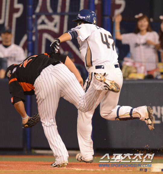 1루수 박종윤은 유격수 신본기에게 공을 넘겨 나성범을 몰아갔다. 하지만 이때 차화준이 홈을 파고 들었고, 신본기의 홈 송구를 포수 강민호가 빠트리면서 다시 동점을 허용했다. 나성범은 편안히 2루를 밟았다.