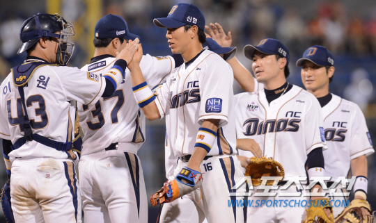 14일 마산구장에서 열린 NC 다이노스와 롯데 자이언츠의 경기는 NC의 10대1 대승으로 마쳤다. 지역 라이벌 롯데와의 홈경기에서 시즌 두번째 스윕을 달성한 NC 선수들이 하이파이브를 하고있다. 마산=최문영 기자 deer@sportschosun.com /2013.07.14/