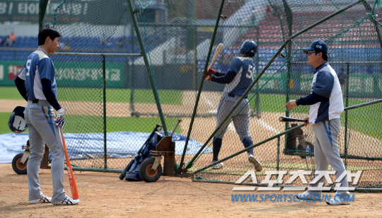 KIA와 NC의 2013 프로야구 주말 3연전 두번째날 경기가 25일 광주 무등구장에서 열렸다. 경기 전 NC 김종호가 김광림 코치의 지도를 받고 있다. 광주=허상욱 기자 wook@sportschosun.com/2013.05.25/