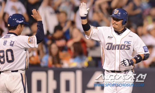 NC 다이노스와 롯데 자이언츠의 2013프로야구 경기가 13일 마산종합운동장 야구장에서 열렸다. NC 7회말 무사 선두타자 이호준이 중월 역전 솔로포를 치고 3루에서 이광길 코치와 하이파이브하고 있다. 마산=최문영 기자 deer@sportschosun.com /2013.07.13/
