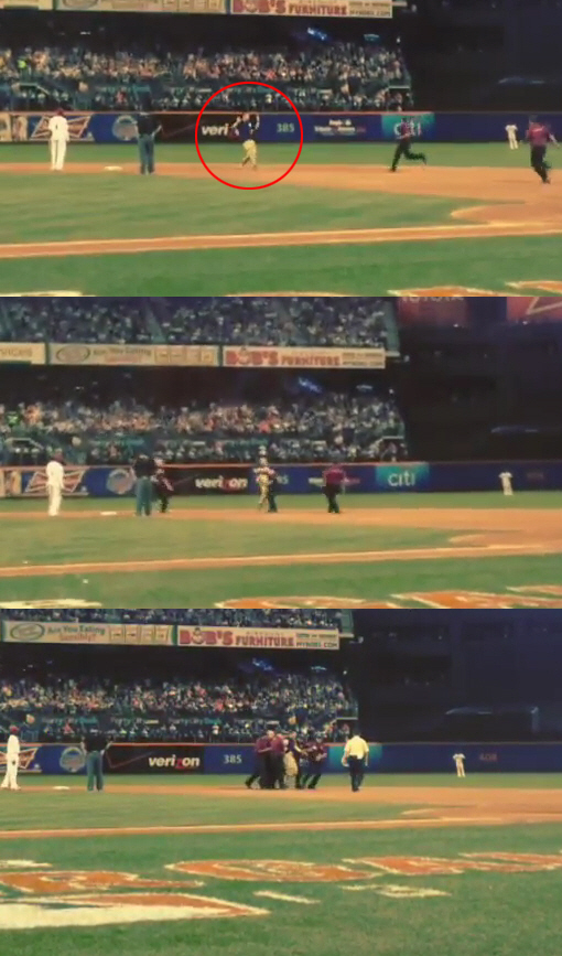 17일(한국시간) 뉴욕 시티필드에서 열린 '2013 메이저리그 올스타전' 5회초, 1,3루 상황에서 10대 후반으로 보이는 젊은 팬이 그라운드 중앙까지 진출하며 4만 관중에게 큰 웃음을 선사했다.