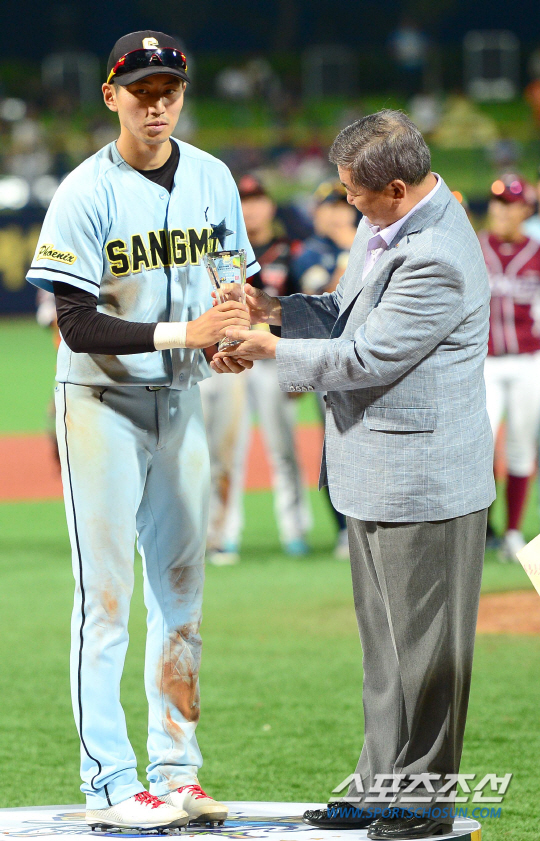 상무 정진호가 대타로 뽑혀 퓨처스리그 올스타전에서 최고의 별에 등극했다. 18일 포항야구장에서 2013 프로야구 퓨처스 올스타전이 열렸다. 남부리그가 북부리그에 4대3으로 승리했다. MVP를 수상한 상무 정진호가 구본능 총재에게 트로피를 전달 받고 있다. 포항=송정헌 기자 songs@sportschosun.com/2013.7.18