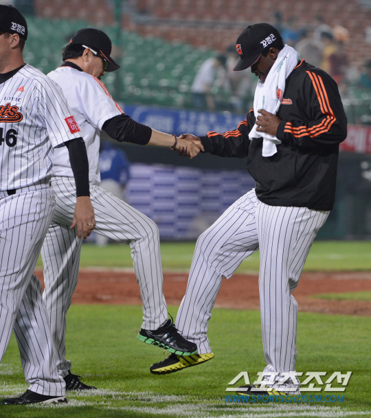 3일 오후 부산 사직야구장에서 2013 프로야구 삼성과 롯데의 경기가 열렸다. 삼성에 9대2로 이기며 승리투수가 된 롯데 유먼이 김시진 감독과 발을 맞추는 세리머니를 펼치고 있다. 부산=김경민 기자 kyungmin@sportschosun.com / 2013.07.03.