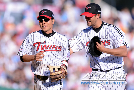 퍄죽의 5연승을 달리고 있는 LG와 스윕 위기에 몰린 롯데가 9일 잠실 야구장에서 다시 만났다. LG 주키치가 선발 등판 롯데 타선을 상대로 역투를 하고 있다. LG 선발 주키치가 2회 2,3루 위기에서 롯데 용덕한의 안타성 타구를 잡아 아웃을 시킨 3루수 권용관의 등을 두드려 주며 환하게 웃고 있다. 잠실=조병관기자 rainmaker@sportschosun.com/2013.06.09/ |