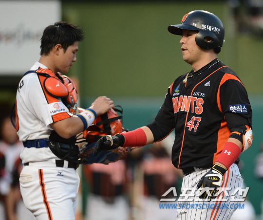롯데 자이언츠와 한화 이글스의 2013 프로야구 경기가 24일 대전구장에서 열렸다. 4회초 1사 1,2루 롯데 강민호가 좌중월 3점홈런을 치고 들어오자 한화 포수 정범모가 허탈해하고 있다. 대전=정재근기자 cjg@sportschosun.com