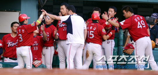 파죽지세 7연승을 달리고 있는 LG와 5위를 달리고 있는 KIA가 24일 잠실에서 다시 만났다. KIA 2회초 2사 2,3루 신종길의 안타로 득점을 올린 이용규와 김선빈이 동료들과 하이파이브를 하고 있다. 잠실=조병관기자 rainmaker@sportschosun.com/2013.07.24/
