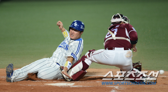 넥센 히어로즈와 삼성 라이온즈의 2013 프로야구 경기가 26일 대구구장에서 열렸다. 6회말 1사 1루 삼성 채태인의 좌익수앞 안타 때 1루주자 최형우가 수비실책을 틈타 홈까지 달려 넥센 포수 허도환을 피해 베이스를 터치하고 있다. 대구=정재근기자 cjg@sportschosun.com/2013.07.26/ |