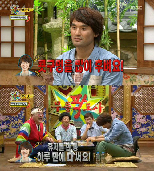 이어 MC 강호동이 "혹시 남편이 고쳤으면 하는 습관이 있느냐?"고 묻자 박리혜는 "비염이 있어서 콧구멍을 많이 후빈다. 휴지 한 통을 하루 만에 다 쓴다"고 폭로해 박찬호를 당황케 했다.