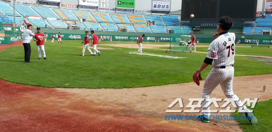 좀처럼 볼 수 없는 장면이 부산에서 나왔다. 롯데 김시진 감독과 SK 이만수 감독이 경기전 캐치볼로 몸을 푼 것.