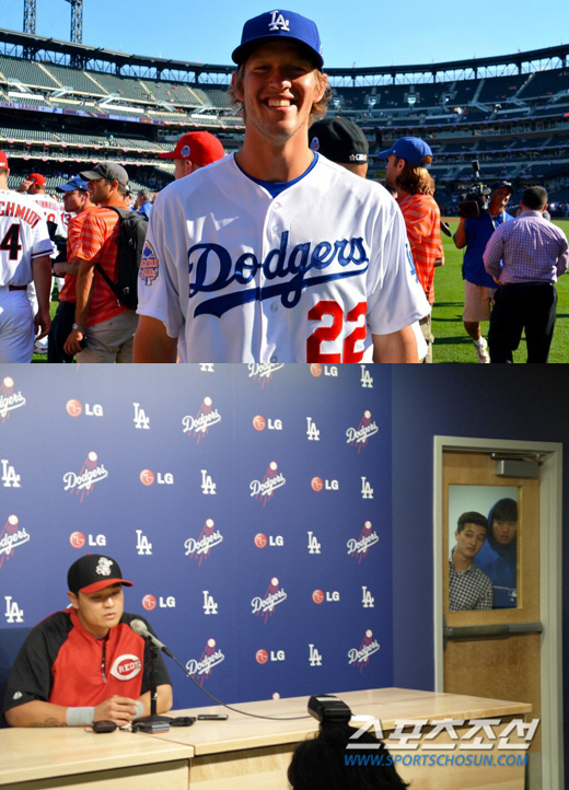 클레이튼 커쇼/신시내티 추신수가 인터뷰를 하고 있는 모습을 LA 다저스 류현진과 그의 통역인 마틴 김이 인터뷰실 출입문 창을 통해 호기심어린 표정으로 지켜보고 있다. 사진=LA 다저스 트위터, LA 곽종완 통신원
