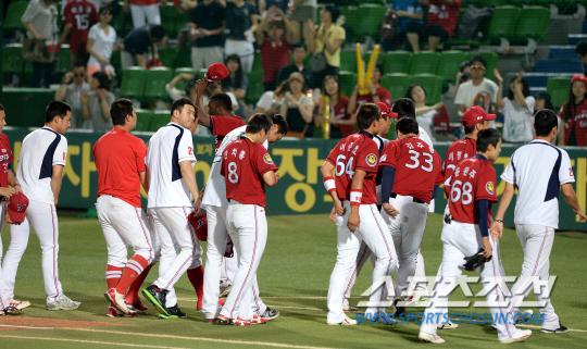 삼성과 KIA의 주말 3연전 마지막날 경기가 30일 대구 시민구장에서 열렸다. 삼성에 10대1로 패하며 스윕과 함께 4연패에 빠진 KIA 선수들이 팬들에게 인사를 하고 있다. 대구=허상욱 기자 wook@sportschosun.com/2013.06.30/ |