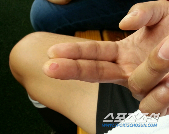 롯데 김사율이 28일 부산 SK전을 앞두고 하루전 등판 때 벗겨진 오른손 중지를 보여주고 있다. 부산=권인하 기자 indyk@sportschosun.com
