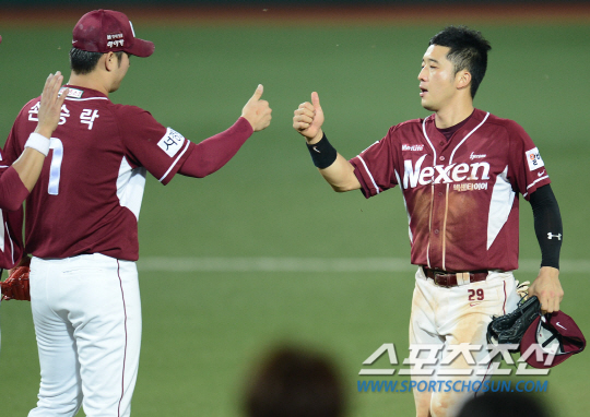 넥센 히어로즈와 삼성 라이온즈의 2013 프로야구 경기가 28일 대구구장에서 열렸다. 선발 나이트에 이어 9회 등판해 5-2의 승리를 지킨 넥센 마무리 손승락이 이택근(왼쪽)과 하이파이브를 하고 있다. 대구=정재근기자 cjg@sportschosun.com