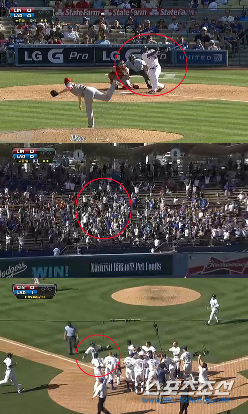 푸이그는 동료들의 환호 속에 홈 베이스를 슬라이딩으로 터치하는 세리머니로 기쁨을 드러냈다.