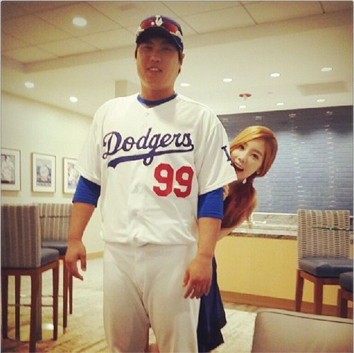 공개된 사진 속 태연은 류현진의 등 뒤에 숨어 얼굴만 내놓고 귀엽게 웃고 있으며, 류현진은 어색한 표정을 짓고 있으면서도 태연이 귀여운지 '아빠미소'를 짓고 있어 눈길을 끌었다.