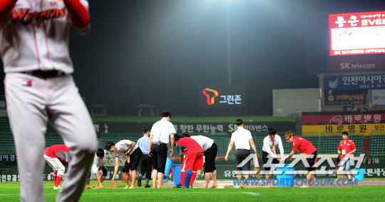 이날 문학구장엔 빗줄기가 거셌다. 7회말 비로 한 차례 6분간 중단됐던 경기는 8회말이 시작된 오후 9시 10분에 다시 비가 거세지며 두번째로 중단됐다. 비가 잦아들면서 구장 관리요원들이 나와 고인 물을 빼내려 애썼지만, 다시 비가 쏟아지면서 9시 44분 강우콜드게임이 선언됐다.