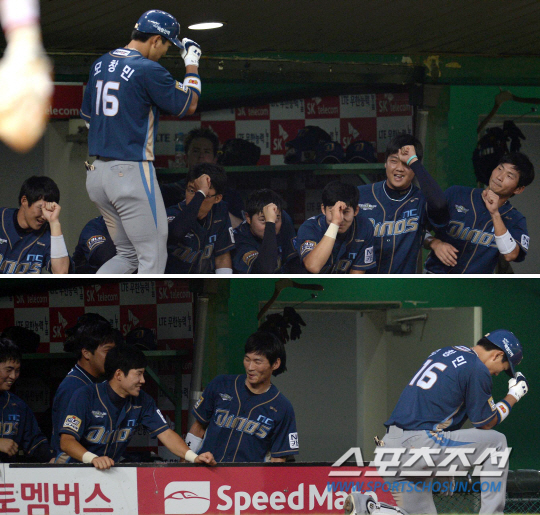 30일 인천 문학구장에서 프로야구 SK와 NC의 주중 3연전 첫 경기가 열렸다. NC 모창민이 5회 2사에서 중월 솔로포를 날렸다. 덕아웃에서 동료들이 따라하는 가운데 세리머니를 펼치고 있는 모창민. 인천=송정헌 기자 songs@sportschosun.com