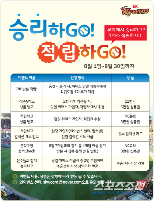 SK는 8월 1일부터 30일까지 1개월간 'SK와이번스 모바일 적립 카드'를 이용하는 관람객을 대상으로 '승리하 Go! 적립하 Go!' 이벤트를 실시한다.