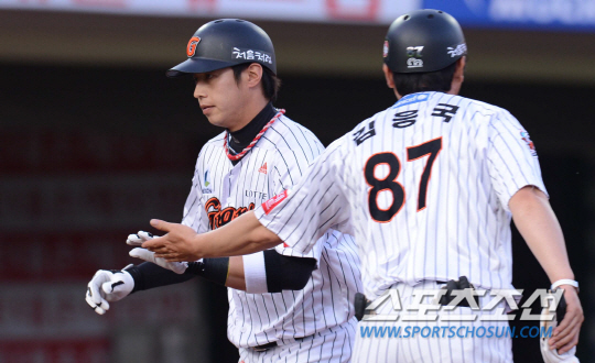 롯데 자이언츠와 KIA 타이거즈의 2013프로야구 경기가 4일 부산 사직야구장에서 열렸다. 롯데 2회말 1사에서 김대우가 우월 솔로홈런을 치고 김응국 코치의 축하를 받고있다. 최문영 기자 deer@sportschosun.com
