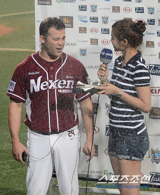 넥센 히어로즈와 삼성 라이온즈의 2013 프로야구 경기가 28일 대구구장에서 열렸다. 8이닝 2실점으로 승리투수가 된 넥센 나이트가 KBSN 정인영 아나운서와 승리투수 인터뷰를 하는 가운데 통역이 인공눈을 뿌리고 있다. 대구=정재근기자 cjg@sportschosun.com
