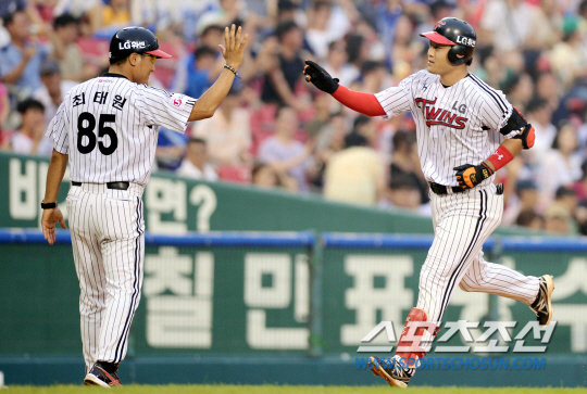 선두 다툼을 하고 있는 삼성과 LG가 위닝시리즈를 놓고 4일 잠실에서 다시 만났다. LG 정의윤이 4회말 동점 솔로 홈런을 터뜨리고 최태원 코치와 하이파이브를 하고 있다. 잠실=조병관기자 rainmaker@sportschosun.com/2013.08.04/
