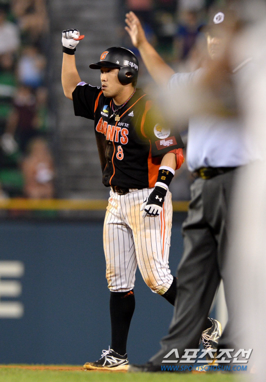 전준우가 롯데 자이언츠의 타순 4번 적임자일까. LG와 롯데의 2013 프로야구 경기가 8일 잠실구장에서 열렸다. 7회초 무사 1루 롯데 전준우가 좌중간을 가르는 1타점 2루타를 치고 기뻐하고 있다. 잠실=허상욱 기자 wook@sportschosun.com/2013.08.08/ |