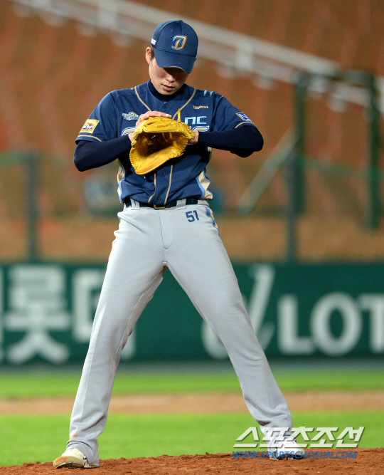 롯데와 NC의 주중 3연전 마지막날 경기가 27일 부산 사직구장에서 열렸다. 7회말 2사 만루 NC 이재학이 롯데 이승화를 몸에 맞는 볼로 진루시키며 밀어내기로 득점을 허용하자 아쉬워하고 있다. 부산=허상욱 기자 wook@sportschosun.com/2013.06.27/