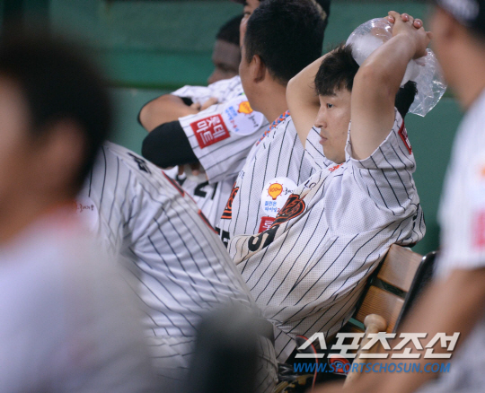 전국이 폭염에 시달린다. 야구장도 예외는 아니다. 2군 선수들 중에는 쓰러지는 선수가 종종 있다. 6일 오후 부산 사직야구장에서 2013 프로야구 KIA와 롯데의 경기가 열렸다. 롯데 손아섭이 덕아웃에서 얼음 주머니로 더위를 식히고 있다. 부산=김경민 기자 kyungmin@sportschosun.com / 2013. 08.06. |