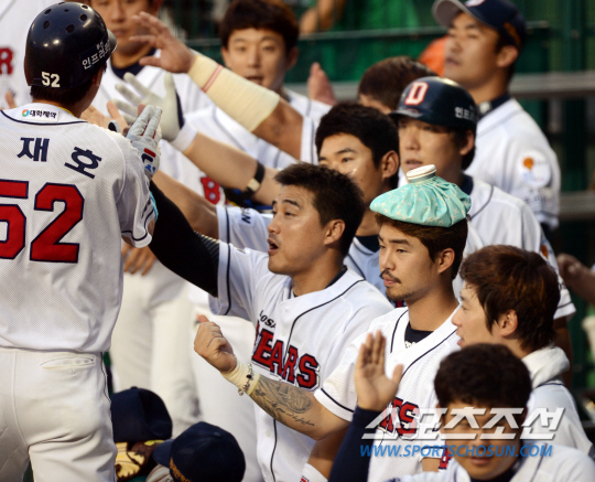 전날 3,4위 자리 바꿈을 한 두산과 넥센이 7일 잠실에서 다시 만났다. 두산 2회말 공격에서 이종욱의 안타로 득점을 올린 김재호가 동료들과 하이파이브를 하고 있다. 얼음 주머니를 머리에 쓴 오재원의 모습이 재미 있다. 잠실=조병관기자 rainmaker@sportschosun.com/2013.08.07/ |
