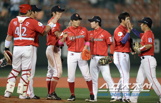 | 8일 서울 목동야구장에서 프로야구 넥센과 SK의 경기가 열렸다. SK가 넥센에 4대1로 승리했다. 경기 종료 후 승리를 거운 SK 선수들이 하이파이브를 나누고 있다. 목동=송정헌 기자 songs@sportschosun.com |