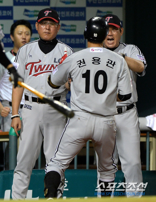재밌는 건 김 감독이 스스로 밝힌 홈런 후 상황. 김 감독은 "평소 덕아웃에서 감정 변화에 대한 티를 내지 않으려 노력하는데 이번 홈런에는 나도 모르게 기합이 들어가고 박수가 나왔다"며 쑥쓰러워했다. 그도 그럴 것이 11년 만의 포스트시즌 진출을 위한 승부처에서 잠실 라이벌 두산을 만났다. 2연전 첫 경기부터 투수들을 총출동시키며 승리에 대한 의지를 드러냈다. 만약, 이 경기를 패했다면 단순한 1패가 아니었다. 후속 경기들에 영향을 미쳤을 것이 뻔했다. 이와중에 큰 기대를 걸지 않았던 권용관이 홈런을 때려냈으니 세상을 다 가진 기분이었을 것이다. 김 감독은 "소름이 끼쳤을 정도"라고 표현했다. 물론, 곧바로 표정을 가다듬고 무뚝뚝한 표정으로 홈런을 치고 들어오는 권용관을 맞이했다.