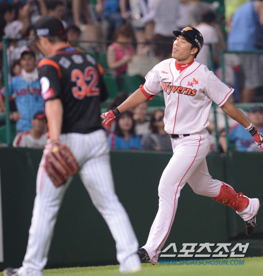SK 와이번즈와 롯데 자이언츠의 2013 프로야구 경기가 11일 인천 문학야구장에서 열렸다. 3-3 팽팽한 접전이 이어지던 9회말 SK 한동민이 롯데 김승회를 상대로 우월 역전 끝내기 홈런을 치고 환호하고있다. 인천=최문영 기자 deer@sportschosun.com /2013.08.11/ |