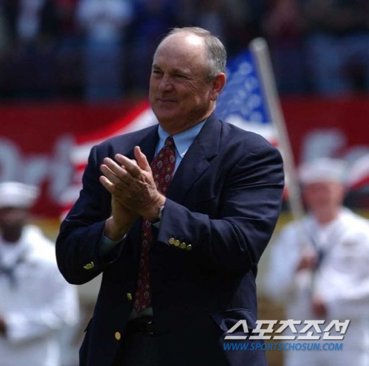 | 기네스북에 등재된 가장 빠른 공을 던진 투수는 놀란 라이언이다. 그는 1974년 메이저리그 최초로 100마일짜리 공을 던진 것으로 공식 인정받고 있다. 지난 2002년 텍사스 레인저스의 홈개막전 행사에 참가한 라이언. 스포츠조선 DB |