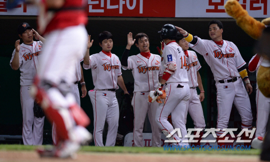 13일 오후 인천 문학야구장에서 2013 프로야구 KIA와 SK의 경기가 열렸다. 4회말 2사서 SK 최정이 중월 솔로홈런을 친 후 덕아웃에서 동료들과 하이파이브를 나누고 있다. 인천=김경민 기자 kyungmin@sportschosun.com