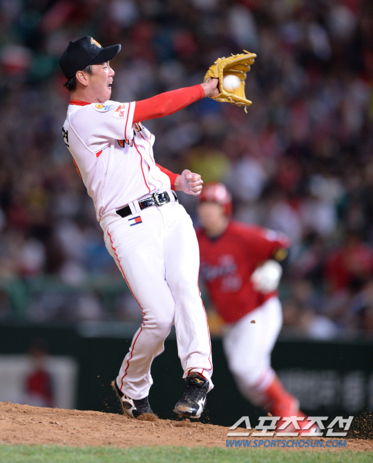 13일 오후 인천 문학야구장에서 2013 프로야구 KIA와 SK의 경기가 열렸다. 6회초 2사 1,3루서 SK 선발투수 김광현이 KIA 차일목의 타구를 잡아내고 있다. 인천=김경민 기자 kyungmin@sportschosun.com / 2013.08.13.