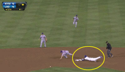 연장전으로 승부를 미룬 다저스는 결국 연장 12회말에 웃었다. 다저스 승리의 하이라이트는 역시 12회 말. 1사 후 야시엘 푸이그가 유격수 옆을 살짝 빠지는 중전안타를 친 뒤 망아지 주루플레이로 2루까지 진루하면서 득점권 찬스를 잡았다. 비정상적인 주루 플레이에 뉴욕 메츠의 송구 실수도 일어났다. 이어 1사 2루 기회에서 애드리언 곤잘레스 끝내기 안타가 터지며 경기를 마무리지었다. 패색이 짙었던 긴 경기 시간에도 끝까지 자리를 지키던 홈팬들과 덕아웃에 있던 선수들은 기뻐 날뛰었다. 한국산 괴물 류현진도 덕아웃에서 뛰어 나와 '끝내기 안타 주인공' 곤잘레스의 머리를 제일 먼저 때리고 들어가는 '덩크슛 세리머니'를 선보였다.