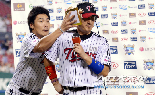 1위를 노리는 2위 LG와 최하위 한화의 2013 프로야구 경기가 광복절인 15일 잠실 야구장에서 펼쳐 졌다. 7회 극적인 역전 2루타를 친 이진영이 수훈선수 인터뷰를 하는 동안 이동현이 케이크를 들고 다가가 얼굴에 칠하고 있다. 잠실=조병관기자 rainmaker@sportschosun.com