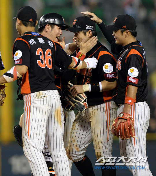 LG와 롯데의 2013 프로야구 경기가 8일 잠실구장에서 열렸다. 9회말 2사 2,3루 LG 오지환의 안타성 타구를 호수비로 잡으며 경기를 끝낸 롯데 중견수 전준우가 승리의 기쁨을 나누고 있다. 잠실=허상욱 기자 wook@sportschosun.com/2013.08.08/