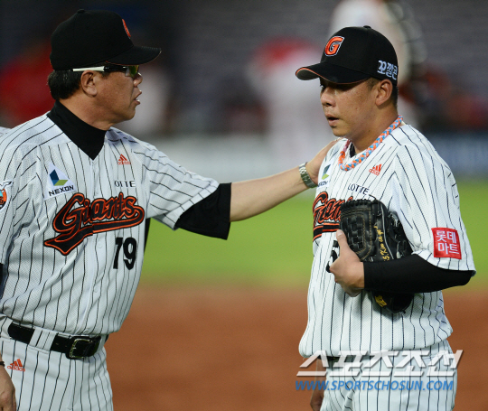 11년 만에 선발 승을 거둔 김사율은 올해 팀에 보탬이 되지 못해 미안했다고 말했다. 이번에 아니면 안 된다는 생각으로 마운드에 올랐다. SK 와이번스와 롯데 자이언츠의 2013 프로야구 경기가 27일 부산구장에서 열렸다. 5회초 SK 김강민 타석에서 롯데 선발 김사율이 중지에 물집에 터져 갑자기 교체됐다. 김시진 감독이 김사율의 어깨를 토닥여주고 있다. 부산=정재근기자 cjg@sportschosun.com