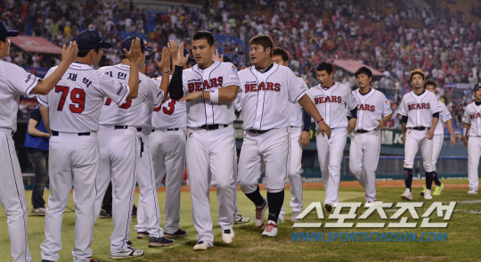 17일 오후 서울 잠실야구장에서 2013 프로야구 SK와 두산의 경기가 열렸다. 4대1로 SK에 승리하며 5연승을 기록한 두산 선수들이 하이파이브를 나누고 있다. 잠실=김경민 기자 kyungmin@sportschosun.com / 2013.08.17. |
