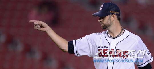 17일 오후 서울 잠실야구장에서 2013 프로야구 NC와 두산의 경기가 열렸다. 7회초 2사 1,2루서 NC 이현곤을 내야 땅볼 처리 한 두산 니퍼트가 이닝 교체때 포수 양의지를 가리키고 있다. 잠실=김경민 기자 kyungmin@sportschosun.com