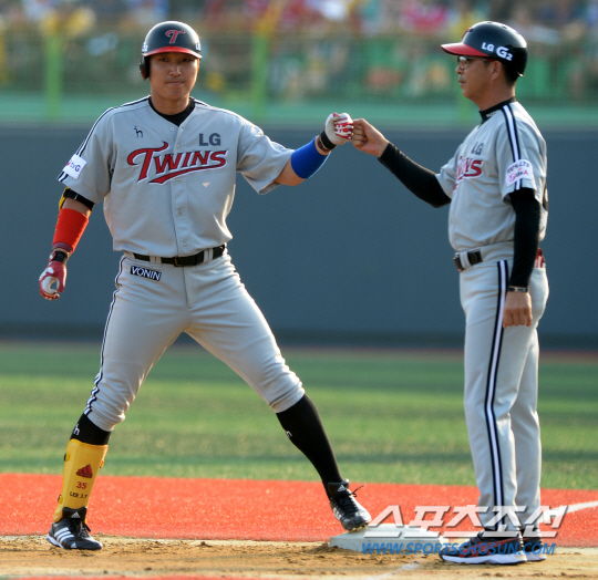 KIA와 LG의 2013 프로야구 주말 2연전 경기가 17일 군산 월명구장에서 열렸다. 1회초 1사 2루 LG 이진영이 중견수 오른쪽으로 흐르는 1타점 적시타를 치고 김인호 1루 코치와 하이파이브를 하고 있다. 군산=허상욱 기자 wook@sportschosun.com/2013.08.17/ |