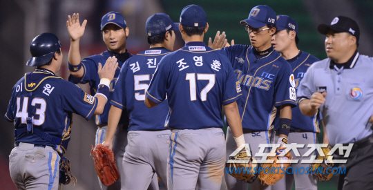 전날 뼈아픈 패배를 당했던 두산이 21일 설욕전을 위해 NC와 잠실에서 만났다. 선발 이재학의 호투와 노장 이호준의 맹타로 두산에 승리를 거둔 NC 선수들이 그라운드에 모여 승리를 자축하고 있다. NC는 갈길 바쁜 두산에 연이틀 승리를 거뒀다. 잠실=조병관기자 rainmaker@sportschosun.com/2013.08.21/ |