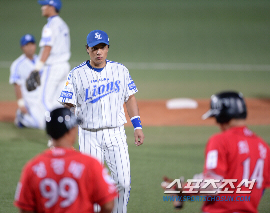20일 오후 대구 시민야구장에서 2013 프로야구 SK와 삼성의 경기가 열렸다. 5회초 2사서 SK 최정의 내야 플라이볼을 사인 미스로 놓친 삼성 이승엽이 1루로 돌아서고 있다. 대구=김경민 기자 kyungmin@sportschosun.com / 2013.08.20. |