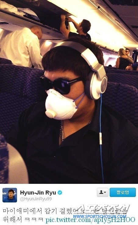LA 다저스 류현진(26)은 23일 트위터를 통해 '마이애미에서 감기에 걸렸어요. 딴 팀원들을 위해서'라는 글과 함께 전용기 안에서 선글라스와 마스크를 쓰고 있는 사진을 게재했다. 류현진은 커다란 헤드폰까지 귀에 걸고 자리를 지키고 있는 모습.