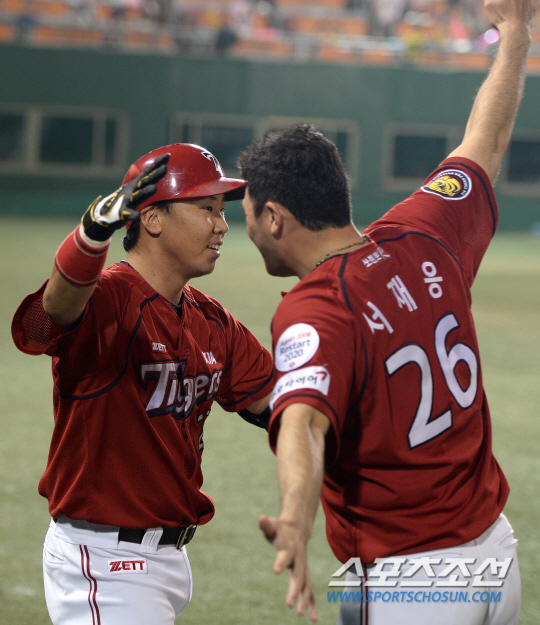 25일 목동구장에서 프로야구 KIA와 넥센의 주말 2연전 두 번째 경기가 열렸다. KIA 5회초 1사 1,2루에서 이범호가 중월 3점포를 날렸다. 덕아웃에서 서재응과 포옹을 나누고 있는 이범호. 목동=송정헌 기자 songs@sportschosun.com/2013.8.25