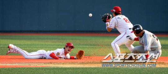 KIA와 LG의 2013 프로야구 주말 2연전 경기가 17일 군산 월명구장에서 열렸다. 1회초 1사 1,2루 KIA 유격수 홍재호가 LG 이병규의 강습 타구를 몸을 날려 막아내 2루수 안치홍에게 토스하고 있다. 하지만 1루주자 정의윤이 2루 세이프되며 내야안타가 됐다. 군산=허상욱 기자 wook@sportschosun.com/2013.08.17/