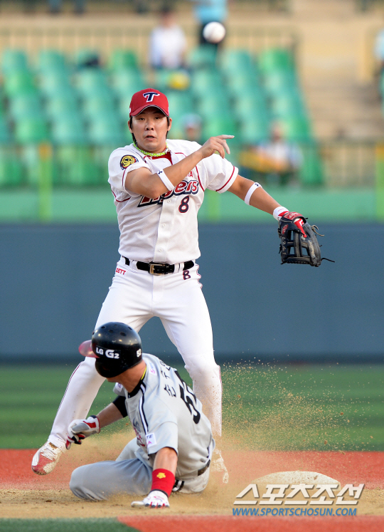 KIA와 LG의 2013 프로야구 주말 2연전 두 번째 경기가 18일 군산 월명구장에서 열렸다. 2회초 1사 만루 LG 조윤준의 내야땅볼때 1루주자 손주인이 2루 포스아웃되고 있다. KIA 2루수는 안치홍. 군산=허상욱 기자 wook@sportschosun.com/2013.08.18/