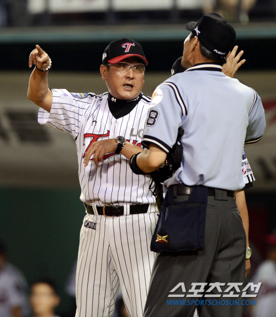 '엘넥라시코' 2위 LG와 4위 넥센의 경기가 27일 잠실 야구장에서 펼쳐 졌다. LG 김기태 감독이 4회 넥센 내야수 서건창의 송구가 덕아웃 위로 향하자 타자 주자가 3루까지 진루해야 한다며 최규순 주심에게 항의를 하고 있다. 하지만 최규순 주심은 송구 시점에 1루에 도달하지 못했으므로 2루까지 가는 것이 맞다는 설명으로 어필을 받아 들이지 않았다. 잠실=조병관기자 rainmaker@sportschosun.com/2013.08.27/ |