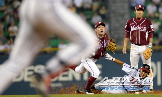 1위 도약을 노리는 LG와 3위에 한 경기차로 접근한 넥센이 잠실에서 만났다. 27일 잠실구장에서 열린 LG와 넥센의 주중 2연전 첫번째날 경기에서 8회말 무사 1루 LG 이병규의 내야땅볼때 1루주자 정주현이 2루 포스아웃되고 있다. 넥센 2루수는 서건창. 잠실=허상욱 기자 wook@sportschosun.com/2013.08.27/ |